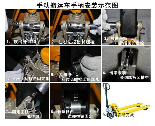 目前,越來越多的場所都會看到手動搬運車的身影,重量輕,容易操作,價格低,又經(jīng)濟實用。特別適用于汽車裝卸及車間、倉庫、碼頭、車站、貨場等地的易燃、易爆和禁火物品的裝卸運輸設(shè)備。下面北京凌鷹技術(shù)人員來教你地牛手柄的安裝,詳情如下: