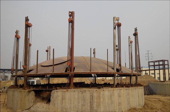 在焊接油罐的第一步就是需要對油罐的整體重量有正確的計算,一般選定電動葫蘆的總額定重量為油罐整體重量的1.3-1.5倍以上。確定焊灌電動葫蘆臺數(shù)后,要精確計算和確定吊點(diǎn)的間距,個各吊點(diǎn)間距一定要相等且均衡布點(diǎn)。由于施工工藝上要求少開天窗,因此首先吊點(diǎn)要盡可能少,除要求首次吊點(diǎn)的間距一致外,還要考慮以后吊點(diǎn)的均衡設(shè)置,以保持各吊點(diǎn)的間距相等,盡可能為電動葫蘆的均載運(yùn)行創(chuàng)造條件。根據(jù)以往的施工經(jīng)驗(yàn),首次吊點(diǎn)一般為選定電動葫蘆總臺數(shù)的一半,第二次吊裝施工完畢后,即在吊裝第三層前要及時補(bǔ)進(jìn)其余所有吊點(diǎn)立柱,掛上整套焊灌電動葫蘆,全部投入第三層的吊裝運(yùn)行。