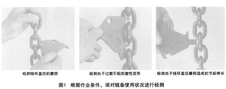(3)檢查鏈環(huán)磨損及伸長:用生產(chǎn)廠商提供的標(biāo)牌進(jìn)行簡單檢測 (見圖1 ) 。