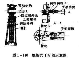 1、螺旋千斤頂,如圖1-110所示,簡單的千斤頂。其由鋼制外殼和螺桿及固定哎外殼上的螺母組成。轉(zhuǎn)動手柄即將重物頂起或降下。為了省力和頂升平穩(wěn),手柄常帶有棘輪,