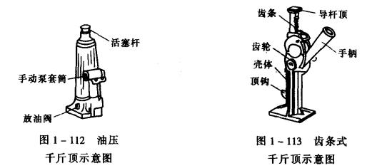 棘輪手柄由棘輪、棘輪卡、手柄套筒組成。還有一種傘齒輪式螺旋千斤頂,如圖1-111所示。扳動操作手柄,經(jīng)過傘形齒輪傳動,將千斤頂升起,這種千斤頂上還裝有一個換向扳鈕,可控制千斤頂?shù)纳蛯?。螺旋前幾單均有自鎖作用,所以重物不會因停止操作而突然下降,也無漏油等故障問題,維護(hù)保養(yǎng)也較方便,能在垂直、橫臥或倒放等幾種位置狀況下使用。使用的有5、10、15、30、50t等規(guī)格。手柄操作力有十多公斤到幾十公斤不等,由1-3人操作。
