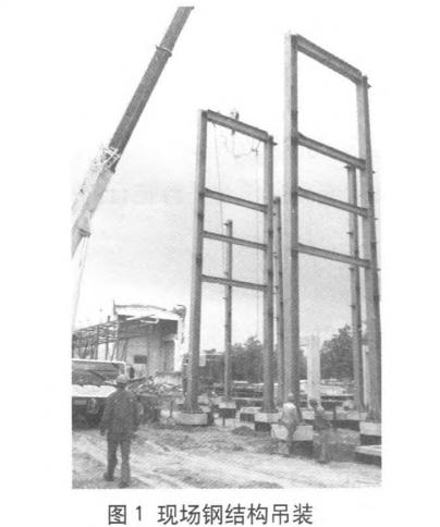 吊車選擇:現(xiàn)場鋼結構吊裝時,成片鋼結構常采用一機主吊、一機抬吊法進行吊裝,立柱常采用單機旋轉法進行吊裝。由于成片鋼結構整體重量重于10t,高度在20m以上,吊點一般設置在頂部橫梁處,雙吊點吊裝。所以根據(jù)情況考慮負載、地面脫鉤,在吊裝過程中選用大噸位、長臂吊車。且吊索高度應與立柱或者鋼結構高度一致,吊車吊裝高度至少為鋼結構高度的一倍。