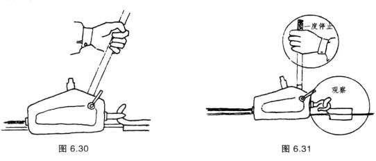 ⑧鋼絲繩固定端,必須確認其穩(wěn)定程度或強度,為此,在扳動前進桿使被牽引物體剛剛受力時要一度停止扳動,觀察固定端及鋼絲繩有無異常,確認無異常后方可繼續(xù)操作,如圖6.31所示。