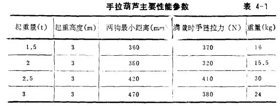 手扳葫蘆比手拉葫蘆及環(huán)鏈電動葫蘆都輕巧。一般手拉葫蘆的安全系數(shù)n=2,但手扳葫蘆的安全系數(shù)廠家提供n》5。手扳葫蘆的另一有點是提升的高度不受限制,鋼絲繩的長度可作調整。圖4-51為手扳葫蘆外形,表4-3列出手扳葫蘆的主要性能。