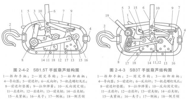 常用的手扳葫蘆有SB1.5T、SB3T兩種型號。其外形如圖2-4-1所示。SB1.5T手扳葫蘆的結(jié)構(gòu)如圖2-4-2所示。SB3T手扳葫蘆的結(jié)構(gòu)如圖2-4-3所示。