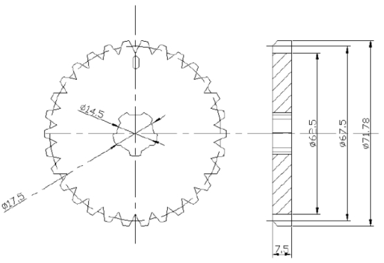 根據(jù)葫蘆傳動齒輪低速重載,根據(jù)手拉葫蘆傳動結(jié)構(gòu)的原理由五尺長軸的小齒輪帶動片齒輪甲、乙,考慮到五尺長軸的小齒輪齒數(shù)甚小等特點,1.5型葫蘆選用了齒形角20°的漸開線特種片齒輪變位齒輪,其基本齒形的基本參數(shù)如圖所示。選用齒形是考慮了以下因素:1.5t葫蘆傳動齒輪的小齒輪齒數(shù)甚少為了避免根切和增強度,只能用正變位切削這樣小齒輪的外圓就受齒條的正切力,片齒輪與短軸屬于過硬配合,片齒輪的中心要設(shè)計出與短軸尺寸屬于硬配合的小花鍵孔尺寸如圖所示: