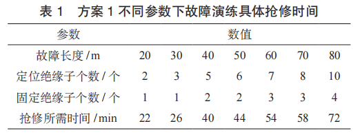 根據(jù)接觸網(wǎng)塌網(wǎng)故障長(zhǎng)度的不同,以及定位和固定絕緣子個(gè)數(shù)的不同,方案1故障演練具體搶修時(shí)間見(jiàn)表1,處理完畢后經(jīng)判斷具備送電條件后即可送電,列車限速通過(guò)。