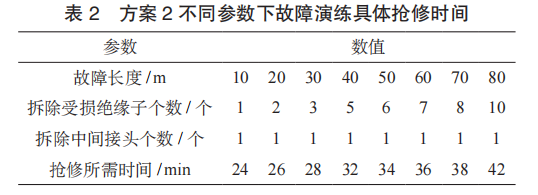 根據(jù)接觸網(wǎng)受損長(zhǎng)度的不同,處理的時(shí)長(zhǎng)也不同,方案2故障演練具體搶修時(shí)間見(jiàn)表2,將該段接觸網(wǎng)拆除后經(jīng)判斷具備送電條件后電調(diào)送電,車輛在通過(guò)該區(qū)域時(shí),必須降弓通過(guò),否則會(huì)造成二次故障。