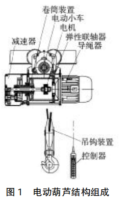 鋼絲繩電動(dòng)葫蘆又可以分為單速提升型、雙速提升型、微型電動(dòng)葫蘆、卷?yè)P(yáng)機(jī)、多功能提升機(jī)等多種類(lèi)型?;S常用電葫蘆為微型電動(dòng)葫蘆或懸臂葫蘆,往往在加料或維修車(chē)間頻繁進(jìn)行檢維修作業(yè)的固定點(diǎn)位安裝,設(shè)備拆裝位置因綜合考慮現(xiàn)場(chǎng)空間安全和建 造成本往往不會(huì)安裝電動(dòng)葫蘆,化工廠常用電動(dòng)葫蘆結(jié)構(gòu)組成如圖1所示。研究發(fā)現(xiàn),現(xiàn)階段暫未存在同 時(shí)具備所需空間小、成本低廉、便 于移動(dòng)且工作高效的小型起重機(jī) 械,也尚未存在對(duì)借助外力輔助 手拉葫蘆作業(yè)裝置的設(shè)計(jì)研究。