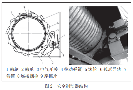 超速保護(hù)裝置中提到了安全制動器,其結(jié)構(gòu)型式見圖2。標(biāo)準(zhǔn)規(guī)定當(dāng)起重機(jī)額定起重量大于5t時(shí),電動葫蘆除設(shè)置一個(gè)工作制動器外,還應(yīng)設(shè)置安全制動器,且設(shè)置在電動葫蘆的低速級上(當(dāng)起重機(jī)額定起重量小于或等于5t時(shí),也宜在低速級上設(shè)置安全制動器,否則電動葫蘆應(yīng)按1.5倍額定起重量設(shè)計(jì)),并要求在正常作業(yè)時(shí),安全制動器應(yīng)在高速軸制動器閉合后延時(shí)閉合,其延時(shí)動作時(shí)間可調(diào),進(jìn)行緊急制動時(shí),安全制動器應(yīng)立即動作。