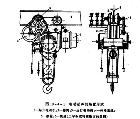 圖10-4-1所示,兩臺電動機各自驅動其起升機構,或運行機構的鋼絲繩式的電動葫蘆其起升機構由電動機、卷筒及其相應的傳動系統(tǒng)所構成,運行機構則包括電動機,并通過傳動系統(tǒng)與驅動輪相連,電動葫蘆通常沿工字鋼下翼緣的踏面移動,當然,在有些場合下,還可沿具有特殊斷面的軌道運行。